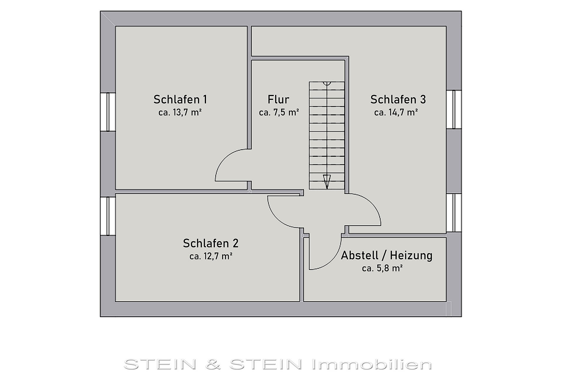 Im Dachgeschoss befinden sich ein Flur, drei Schlafzimmer, sowie der Abstell- / Heizungsraum.
