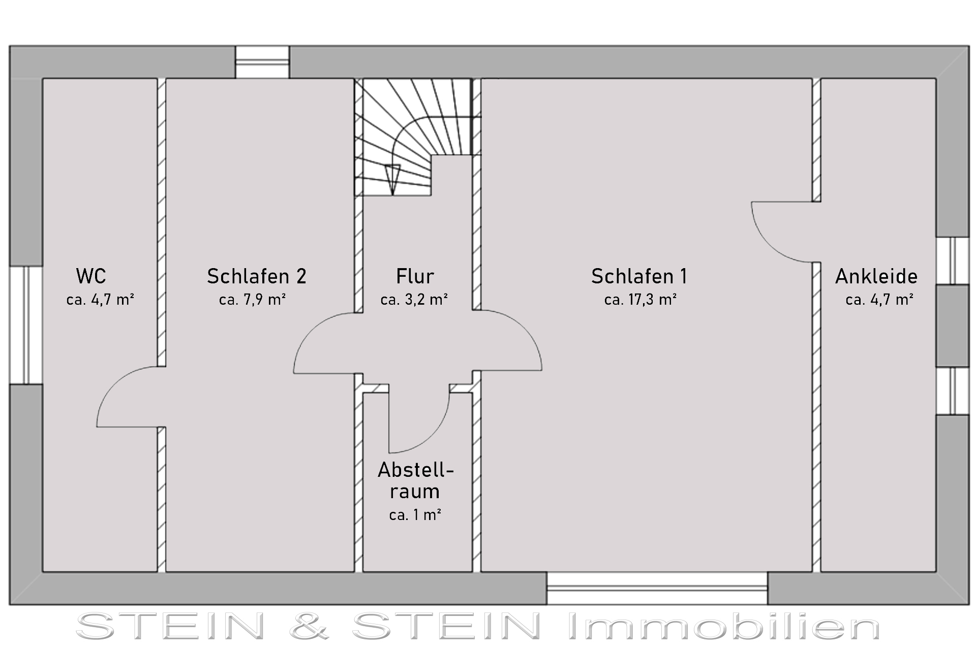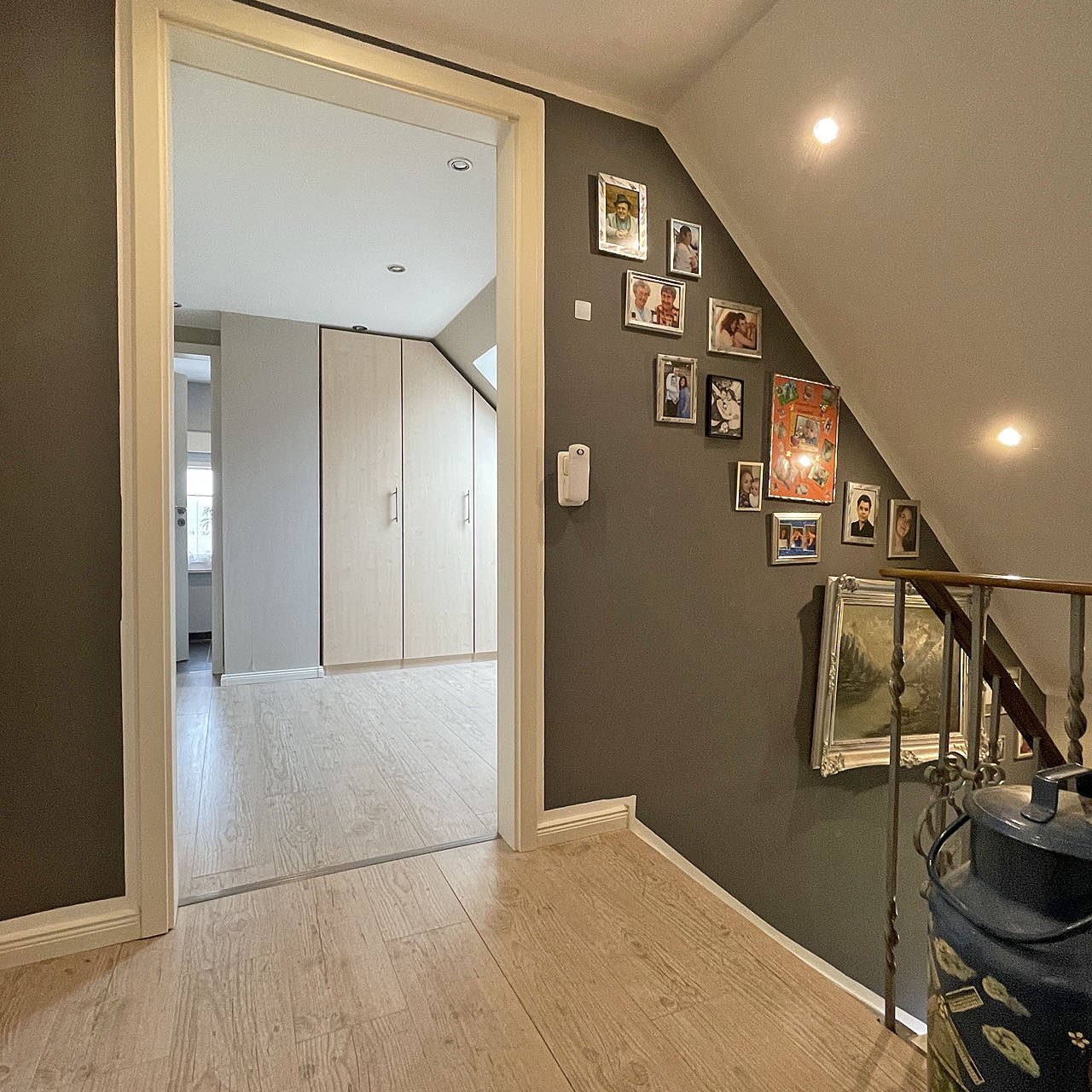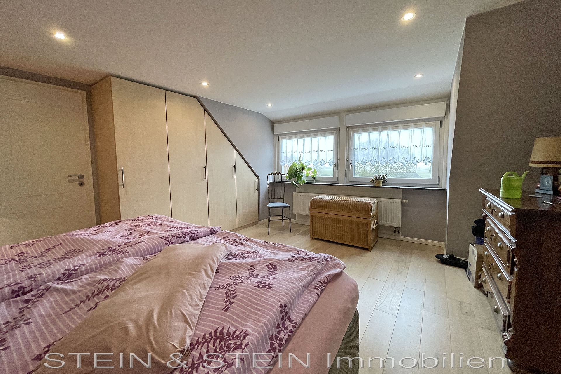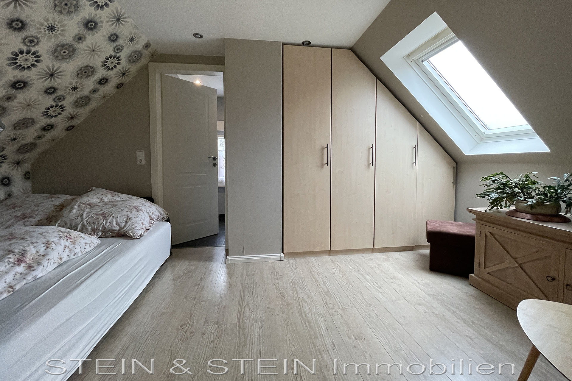 Das Obergeschoss verfügt über einen Flur, sowie ein Schlafzimmer mit Direktzugang zum WC und ein Schlafzimmer mit angrenzendem Ankleidezimmer.