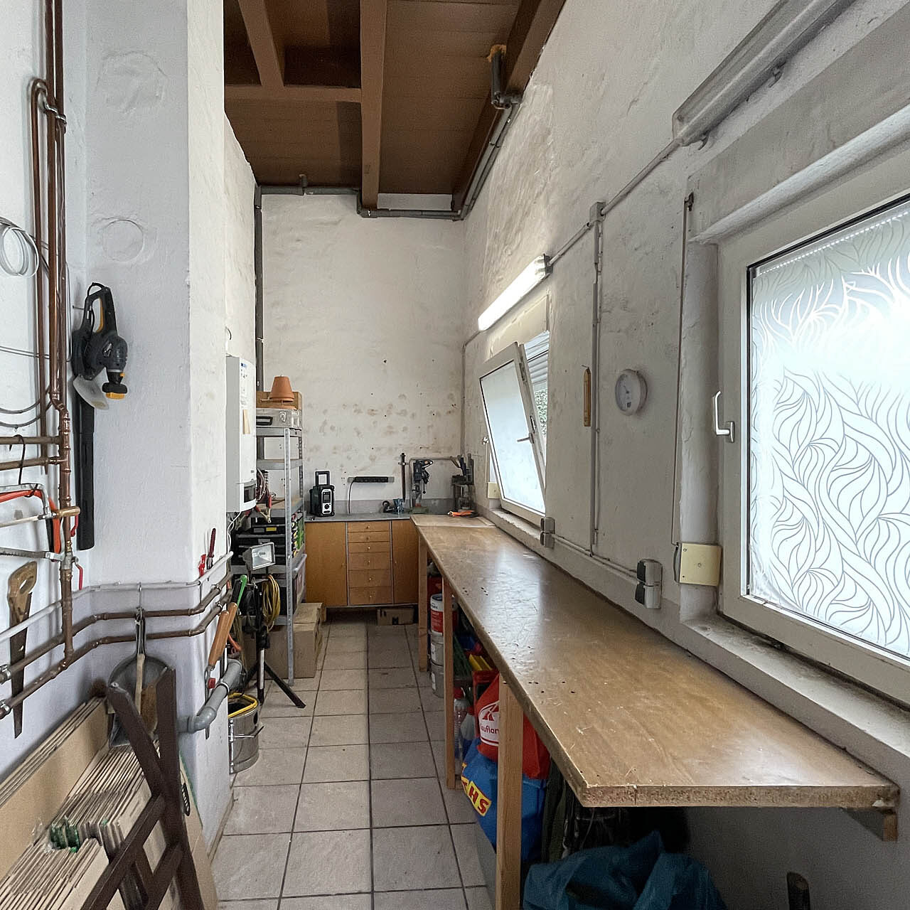 Einen weiteren Abstellraum, der z. B. als Werkstatt oder Lager genutzt werden kann, erreichen Sie durch einen separaten Eingang. Das Gartenhaus bietet Platz für Gartengeräte und Fahrräder.